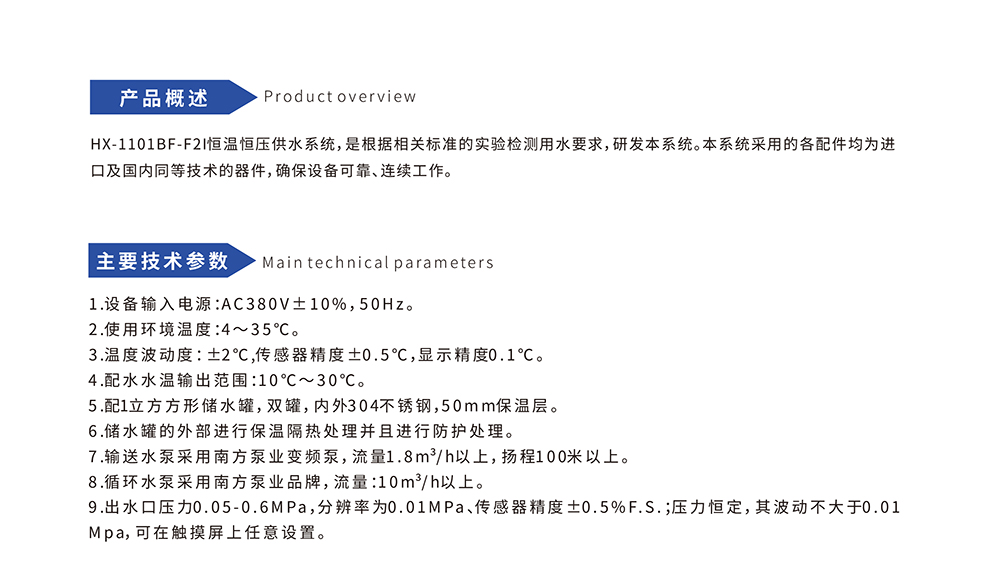 HX-1101BF-F2I恒溫恒壓供水系統,是根據相關標準的實驗檢測用水要求,研發本系統。本系統采用的各配件均為進口及國內同等技術的器件,確保設備可靠、連續工作。