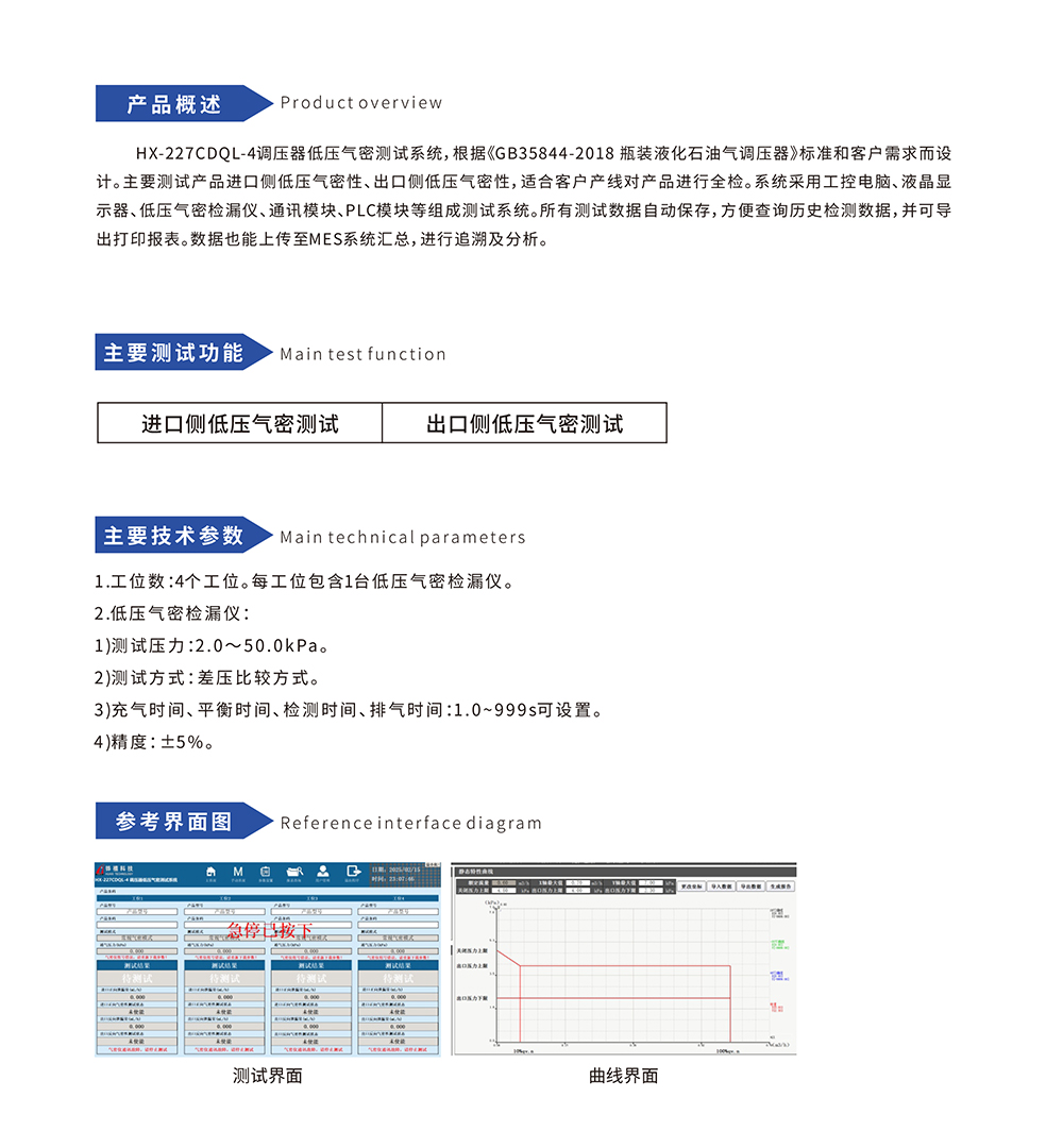 HX-227CDQL-4調壓器低壓氣密測試系統,根據《GB35844-2018 瓶裝液化石油氣調壓器》標準和客戶需求而設計。主要測試產品進口側低壓氣密性、出口側低壓氣密性,適合客戶產線對產品進行全檢。系統采用工控電腦、液晶顯示器、低壓氣密檢漏儀、通訊模塊、PLC模塊等組成測試系統。所有測試數據自動保存,方便查詢歷史檢測數據,并可導出打印報表。數據也能上傳至MES系統匯總,進行追溯及分析。