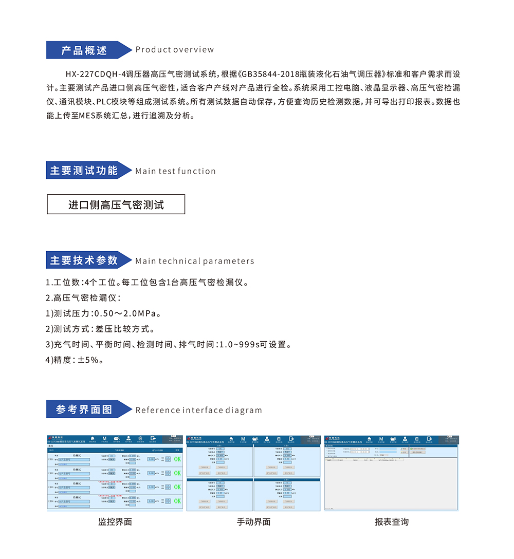 HX-227CDQH-4調壓器高壓氣密測試系統,根據《GB35844-2018瓶裝液化石油氣調壓器》標準和客戶需求而設計。主要測試產品進口側高壓氣密性,適合客戶產線對產品進行全檢。系統采用工控電腦、液晶顯示器、高壓氣密檢漏儀、通訊模塊、PLC模塊等組成測試系統。所有測試數據自動保存,方便查詢歷史檢測數據,并可導出打印報表。數據也能上傳至MES系統匯總,進行追溯及分析。