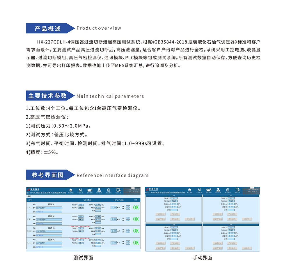 HX-227CDLH-4調壓器過流切斷泄漏高壓測試系統,根據《GB35844-2018 瓶裝液化石油氣調壓器》標準和客戶需求而設計。主要測試產品高壓過流切斷后,高壓泄漏量,適合客戶產線對產品進行全檢。系統采用工控電腦、液晶顯示器、過流切斷模組、高壓氣密檢漏儀、通訊模塊、PLC模塊等組成測試系統。所有測試數據自動保存,方便查詢歷史檢測數據,并可導出打印報表。數據也能上傳至MES系統匯總,進行追溯及分析。