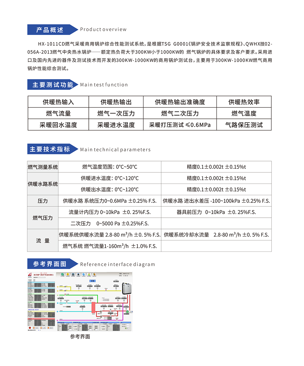 HX-1011CD燃氣采暖商用鍋爐綜合性能測試系統,是根據TSG G0001《鍋爐安全技術監察規程》、QWHX技02-056A-2013燃氣中央熱水鍋爐——額定熱負荷大于300KW小于1000KW的 燃氣鍋爐的具體要求及客戶要求。采用進口及國內先進的器件及測試技術而開發的300KW-1000KW的商用鍋爐測試臺,主要用于300KW-1000KW燃氣商用鍋爐性能綜合測試。