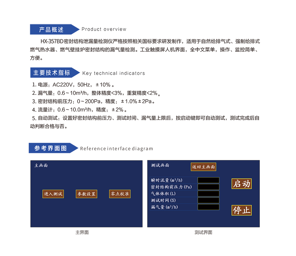 HX-357BD密封結構泄漏量檢測儀嚴格按照相關國標要求研發制作,適用于自然給排氣式、強制給排式燃氣熱水器、燃氣壁掛爐密封結構的漏氣量檢測。工業觸摸屏人機界面,全中文菜單,操作、監控簡單.方便。