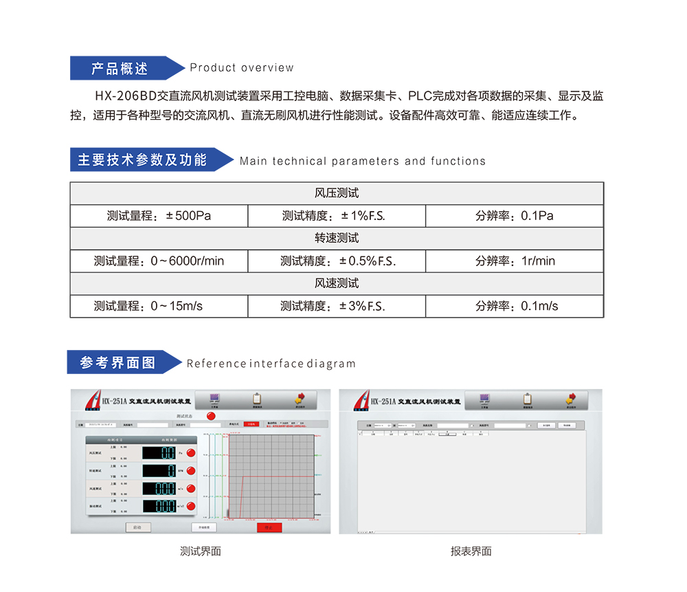 HX-206BD交直流風機測試裝置采用工控電腦、數(shù)據(jù)采集卡、PLC完成對各項數(shù)據(jù)的采集、顯示及監(jiān)控,適用于各種型號的交流風機、直流無刷風機進行性能測試。設(shè)備配件高效可靠、能適應(yīng)連續(xù)工作。