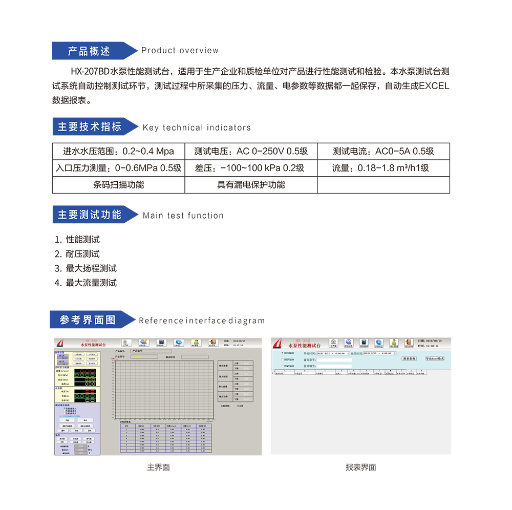 HX-207BD水泵性能測試臺,適用于生產(chǎn)企業(yè)和質(zhì)檢單位對產(chǎn)品進(jìn)行性能測試和檢驗(yàn)。本水泵測試臺測試系統(tǒng)自動控制測試環(huán)節(jié),測試過程中所采集的壓力、流量、電參數(shù)等數(shù)據(jù)都一起保存,自動生成EXCEL數(shù)據(jù)報(bào)表。